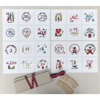 Moi je crois encore et toujours au Père Noël ! Pour une réalisation à la machine, comptez environ 4 heures pour réaliser les 24 petits pochons prêts à être suspendus grâce à leur petite pince à linge. Le long d’une ficelle, ou sur un rideau, ou encore au bord d’une cheminée…vous avez l’embarras du choix. Les pochons finis mesurent environ 10 cm de côté, on peut y cacher plein de petits trésors pour la plus grande joie des petits et des grands ! Vous retrouverez dans ce calendrier 24 vignettes imprimées et numérotées.