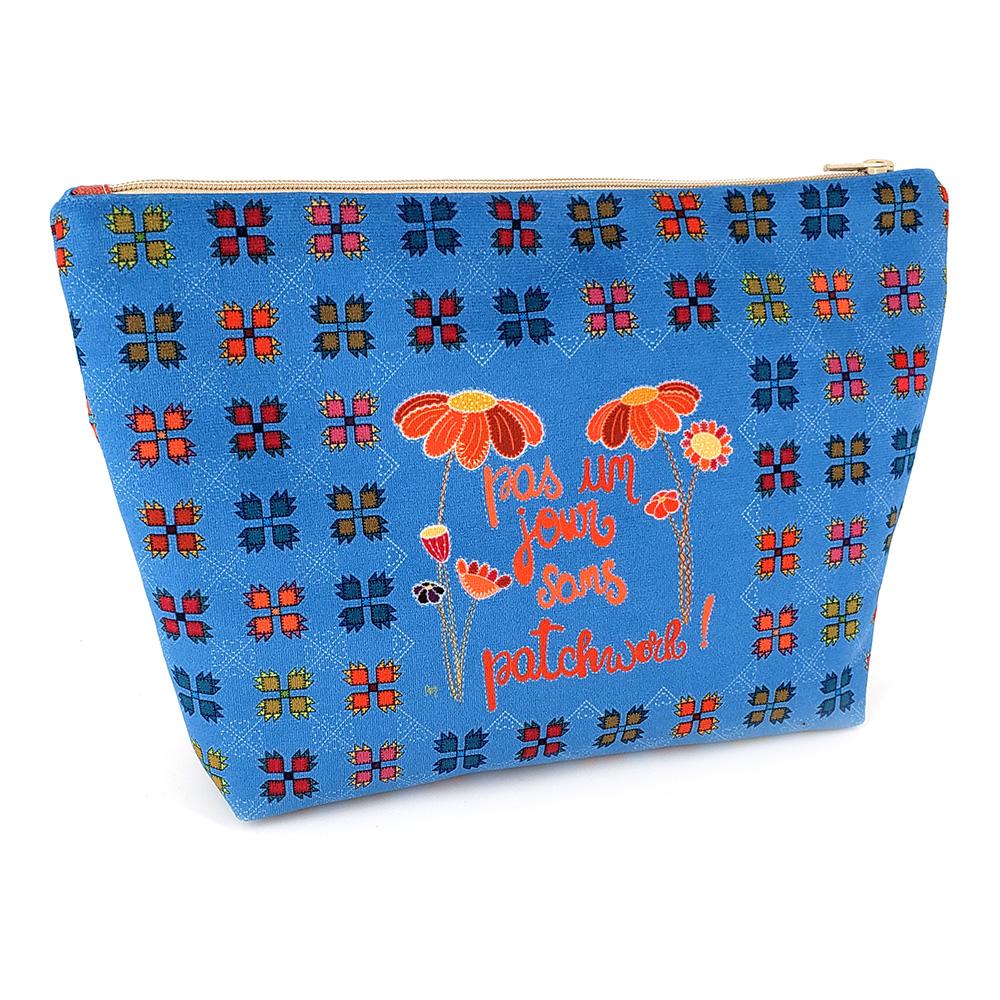 Un petite maison en appliqué aux tons orangés est dessinée au milieu de blocs de patchwork en patte d’ours. Au dos figure l’inscription “pas un jour sans patchwork”. Le fond est de couleur beige.