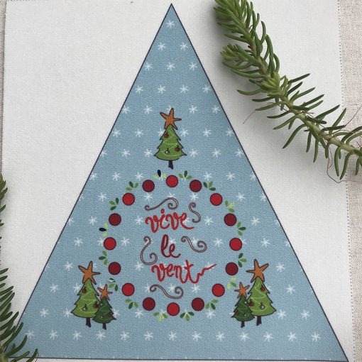 Chaque sapin cousu mesure environ 14 cm de haut et 12 de large, sans l’attache et le tronc.