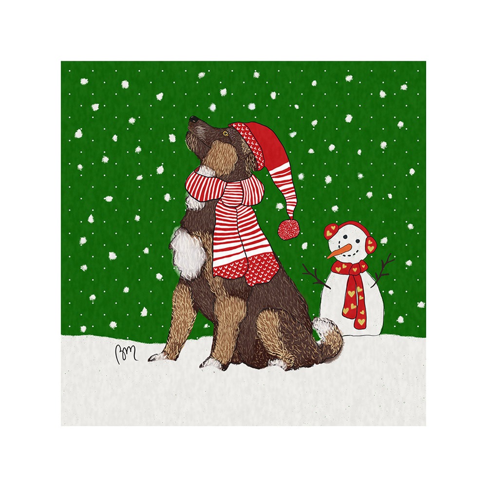Une vignette de Noël avec un chien sous la neige sur fond vert pour customiser vos créations, vos décors de table et sachets cadeau, carte de vœux, déco pour le sapin…